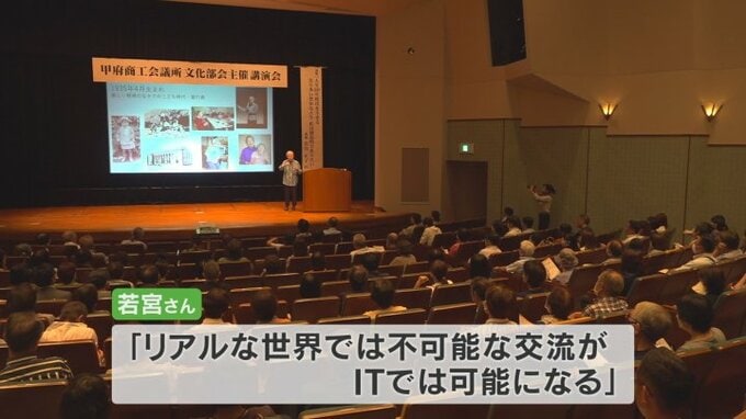 講演では自身のITとの関わりを振り返りながら「リアルな世界では不可能な交流がITでは可能になる」などとメリットを語り「高齢者も活用すべき」と呼びかけました。