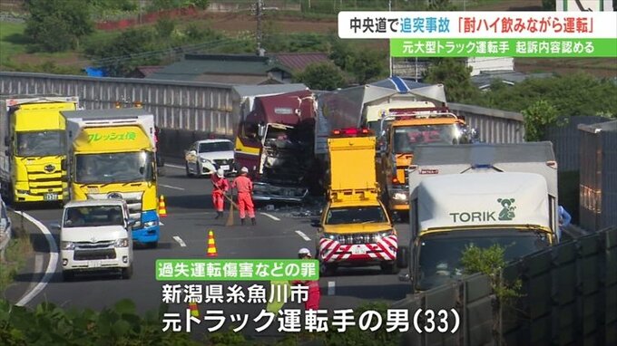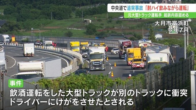 今年7月、山梨県大月市の中央道で飲酒運転をした大型トラックが追突事故を起こしたとされる事件の裁判で、元トラック運転手は「缶チューハイを飲みながら運転していた」などと話しました。