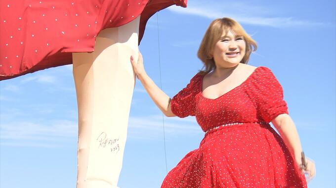 高さ5メートル、自身が題材となったシンボルかかし巨大りんごちゃんと初めて対面しました。9月3日にはじまったかかしロード280を盛り上げようと駆け付けました。お馴染みのものまねを披露すると会場が笑顔に包まれました。