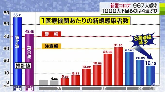 青森県内で確認された新型コロナの感染者は、9月17日までの1週間で967人と3週連続で減少しました。感染者が1000人を下回ったのは4週ぶりです。青森県によりますと新型コロナの感染者は、9月17日までの1週間で県内6…