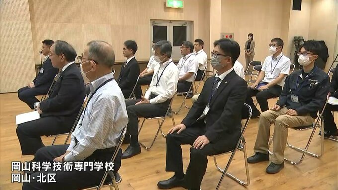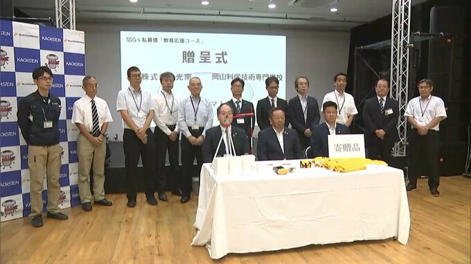専門学生に土木や建築に関する興味を持ってもらおうと、岡山市の土木工事会社が社債を活用して学校に測量道具を贈りました。