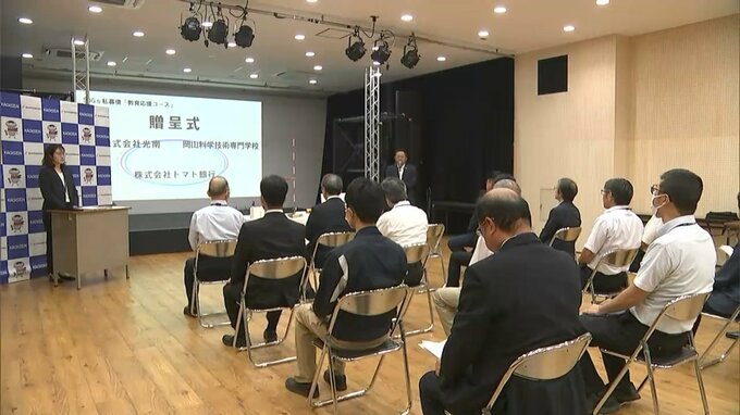 岡山科学技術専門学校で贈呈式が行われ、岡山市南区にある土木工事会社・光南の脇本社長から大月校長に測量道具が贈られました。