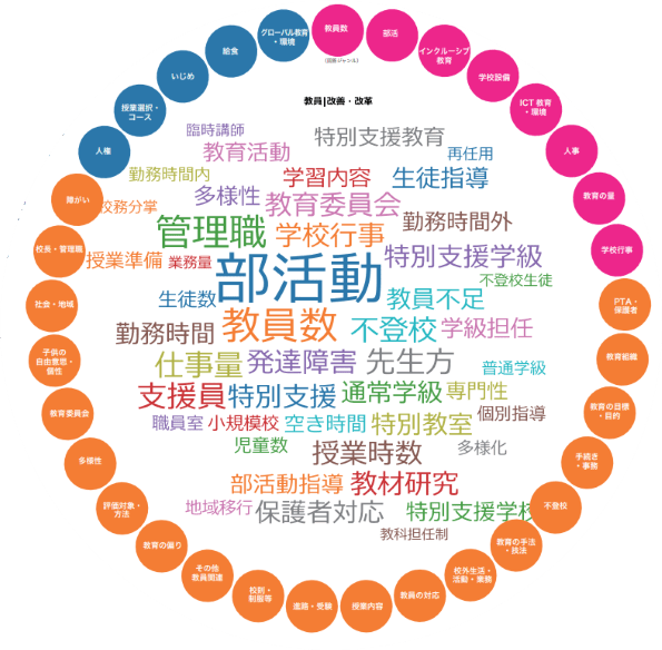 「改善や改革が必要なこと」では、自由記述のキーワードで「部活動」、「教員数」、「管理職」が目立ちました。