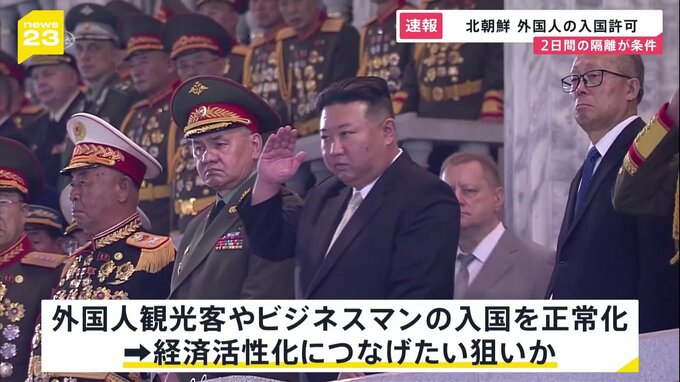 北朝鮮が、きょう25日から外国人の入国を許可したと、中国国営テレビが伝えました。中国国営の中央テレビによりますと、北朝鮮は、きょう25日から、入国後2日間の隔離措置をとることを条件に外国人の入国を許可し…