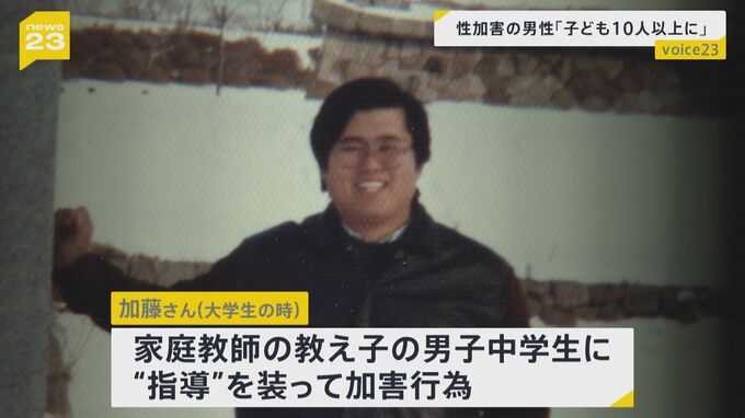 加藤さんは中学生のときから20年以上にわたり、10人以上の子どもたちに性加害をした過去を持ちます。大学生のときには、家庭教師として教えていた男子中学生に対し、指導を装って体を触るなどの加害行為をしたと話します。