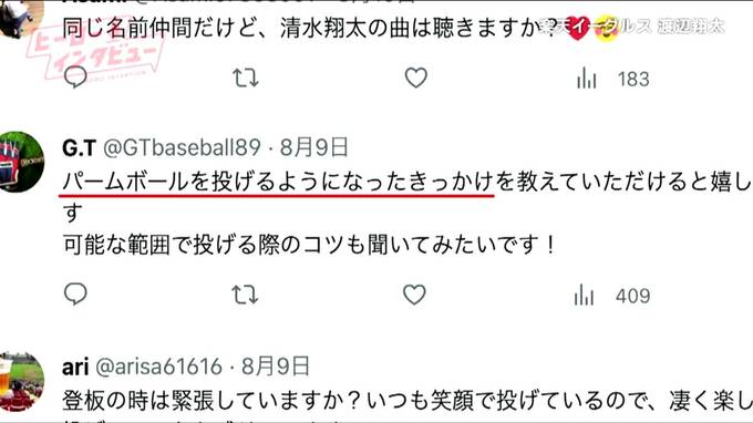 渡辺投手の代名詞と言えば、パームボールです。三振の山を築く最大の武器だけに覚えたきっかけなど、こちらもファンの関心が高かったようです。