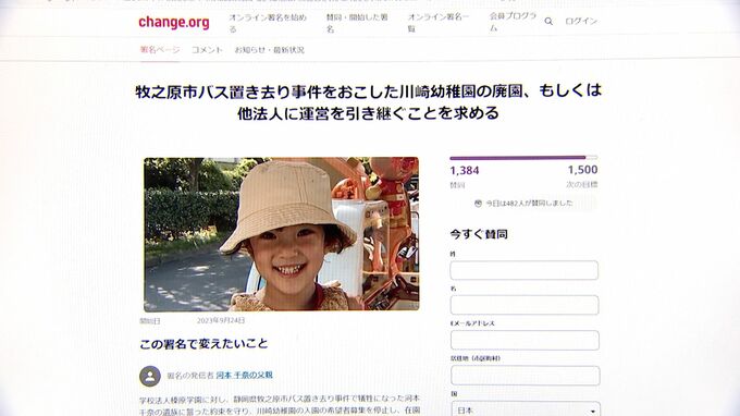 2022年9月、静岡県牧之原市の認定こども園「川崎幼稚園」で河本千奈ちゃん・当時3歳が、通園バスの中に置き去りにされ、死亡した事件で、遺族が園の廃園などを求め、インターネット上で署名活動を始めました。