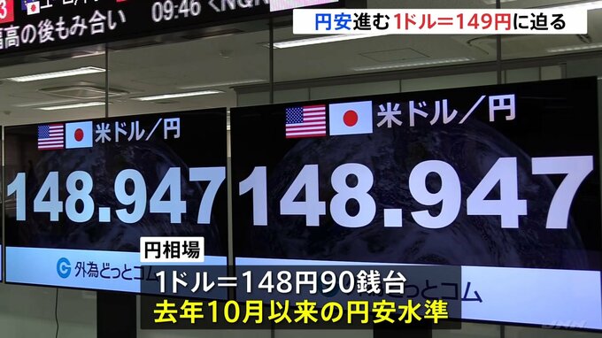 円安がさらに進んでいます。東京外国為替市場で、円相場は1ドル=148円90銭台まで下落しました。アメリカで金融の引き締めが今後も続くとの見方から長期金利が上昇。一方、きのう日銀の植田総裁が大規模な金融緩和…