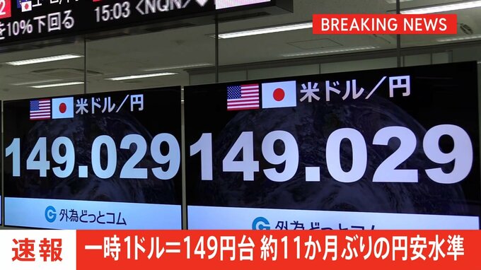 先ほど、東京外国為替市場で円相場は一時1ドル=149円台をつけ、およそ11か月ぶりの水準まで円安が進みました。アメリカでは、金融引き締めが長引くとの観測から、長期金利が上昇しています。一方、きのう、大阪市…