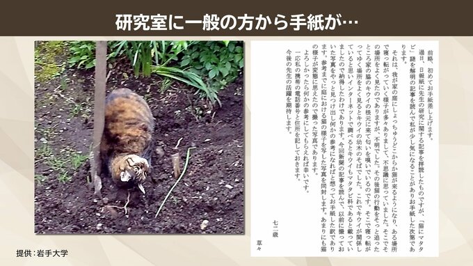 こうした研究成果はネコ好きの人々の反響を呼び、「家の庭では同じマタタビ科のキウイの根にネコが寄ってきて寝っ転がっています」など、一般の人から研究室に手紙が届くほどになりました。