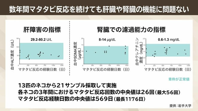 またネコにマタタビを与えることによるストレス反応や肝臓・腎臓への悪影響も見られませんでした。