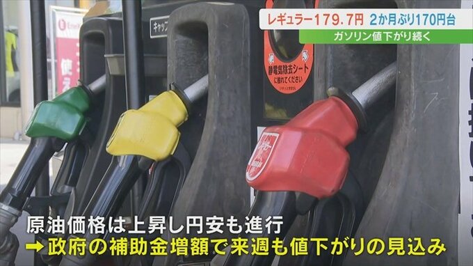ガソリン価格が発表され県内はレギュラーが1L179.7円で2か月ぶりに170円台に値下がりしました。