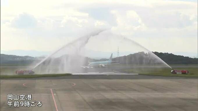 午前9時過ぎ、岡山空港に韓国・ソウルからの乗客138人を乗せた大韓航空のチャーター便が到着し、放水車がアーチで歓迎しました。