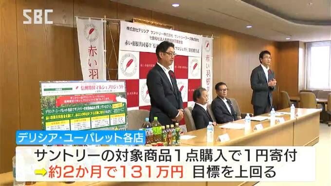 9月3日までのおよそ2か月間、県内のデリシアやユーパレットで、サントリーの対象商品を1つ買うごとに1円が寄付され、目標を上回る131万円あまりが寄せられました。