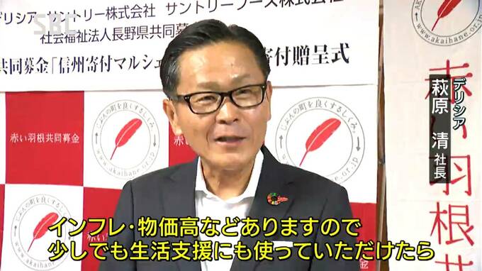 28日に長野市で行われた贈呈式では、松本市に本社がある食品スーパー・デリシアの萩原清(はぎわらきよし)社長から、長野県共同募金会の合津文雄(ごうづふみお)会長に目録が手渡されました。