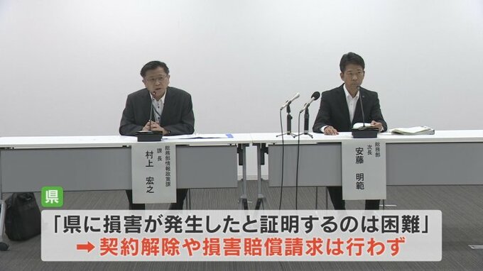 県では独占禁止法に抵触するおそれもあるとして公正取引委員会に通報していますが、すでに工事が完了している事や「客観的状況から県に損害が発生したと証明するのは困難」として契約解除や損害賠償請求は行わないとしています。