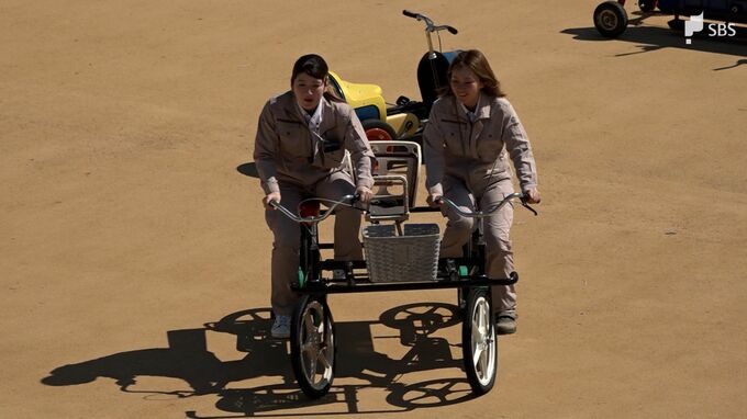 芝生広場の隣には、ユニークな形のおもしろ自転車があります。
