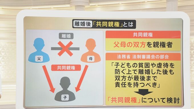 法務省の専門家会議が行っている議論なんですが、離婚した後も、どちらかだけに親権が渡るのではなく2人協力して育てていきましょう、というものが共同親権なわけなんですが、法務省の法制審議会の部会は「子どもの貧困や虐待を防ぐ上で離婚した後も双方が最後まで責任を持つべき」だとして、「共同親権」について検討しているわけなんです。