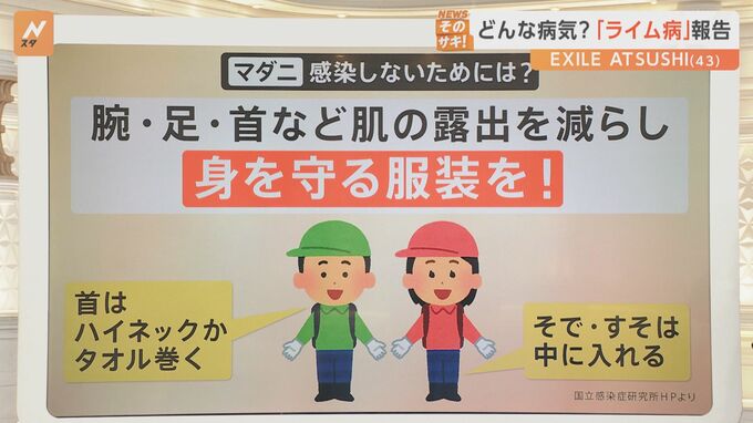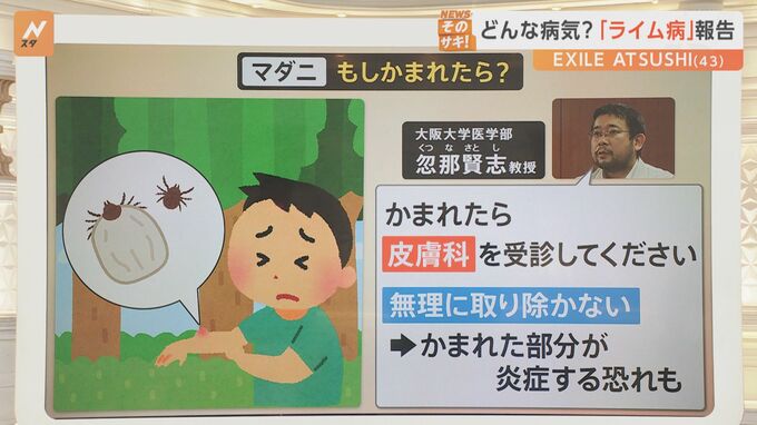 大阪大学医学部の忽那賢志教授によりますと、ライム病とはマダニなどが媒介する感染症の一種で、症状は、発疹・頭痛・倦怠感などで、進行すると慢性関節炎や末端皮膚炎になることもあるそうです。治療法は、2週間から4週間、抗生物質の投与が行われますが、治療後も症状が半年以上続く場合もあるということです。