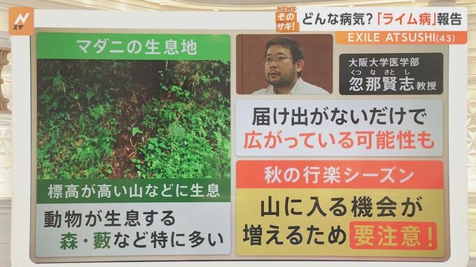 忽那教授によると「日本では年間10例ほどが報告されていますが、届け出がないだけで広がっている可能性もあります。これから秋の行楽シーズンを迎え、山に入る機会が増えるので注意をしてください」ということです。