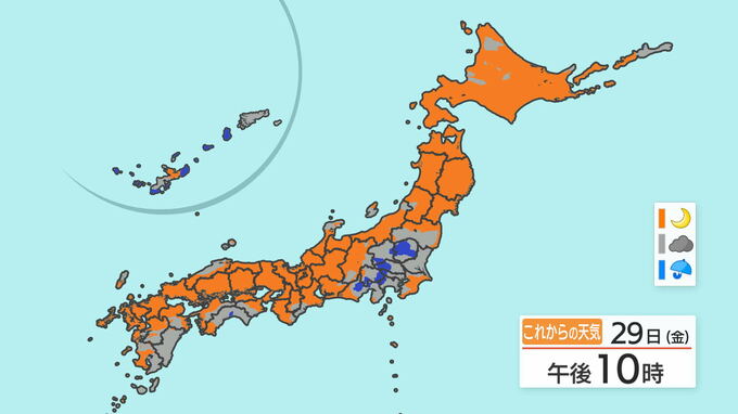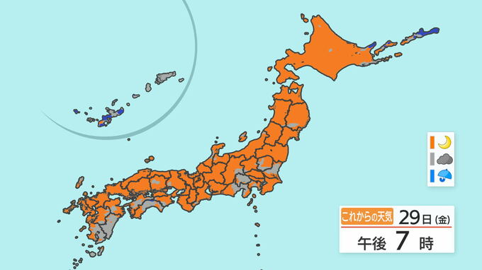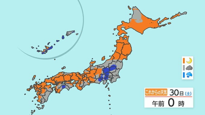 オレンジは晴れ/グレーは曇り/青は雨を示します。九州、四国、東海、関東などでは曇りや雨の時間帯もありそうです。