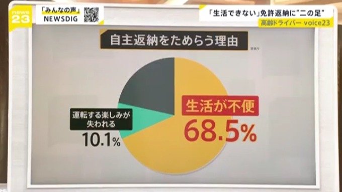 返納率が伸び悩んでいる理由について警察庁のアンケートを見ると、自主返納をためらう理由は、▼「生活が不便」68.5%、▼「運転する楽しみが失われる」10.1%。