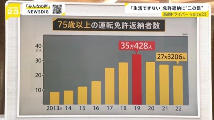 その中で免許を返納した75歳以上の人は、2019年に35万428人いたんですが、そこからだんだん下がっていって、2022年では27万3206人でした。いま、年間で対象者のうち返納率は5%なんですね。