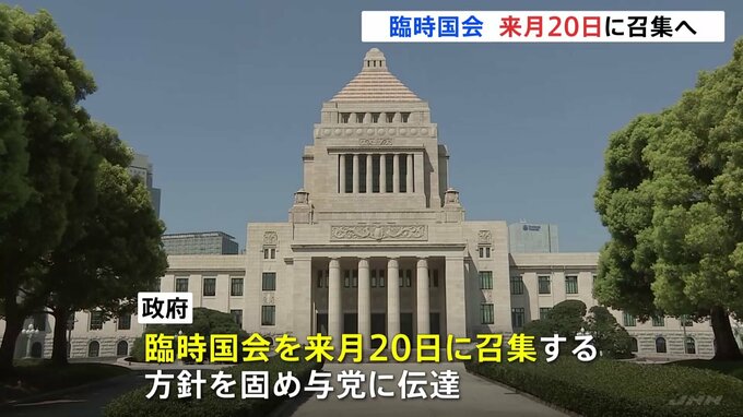 政府が、臨時国会を来月20日に召集する方針を固め、与党に伝えたことが分かりました。9月に行った内閣改造後、初の国会論戦となる見通しです。また、岸田総理は物価高などに対応する経済対策を来月中に策定する考…