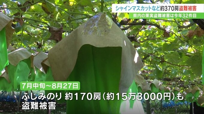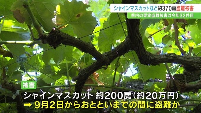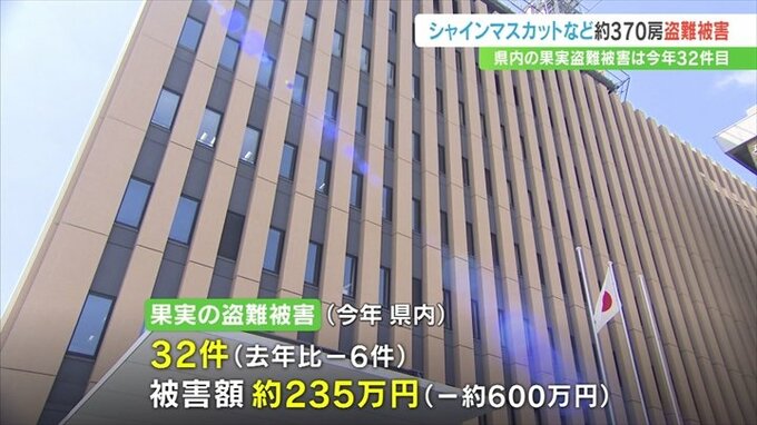 なお県警によりますと、県内のスモモ、モモ、ブドウといった果実の盗難被害は今年32件で、去年より6件減り、被害額は600万円ほど減った約235万円となっています。