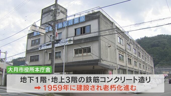 大月市役所の本庁舎は地下1階、地上3階の鉄筋コンクリート造りで、1959年に建てられ老朽化が進んでいます。