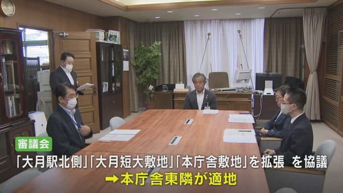 審議会は大月駅北側と大月短大の敷地、それに今の本庁舎の敷地を拡張させた場所の3か所を候補地として協議し、今の本庁舎の敷地を拡張させた場所が適地だと結論づけました。