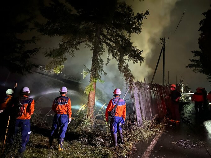 長野県駒ヶ根市赤穂で29日夜、廃タイヤと倉庫が焼ける火事があり、近くのサービスエリアの店舗などが1時間余り停電しました。