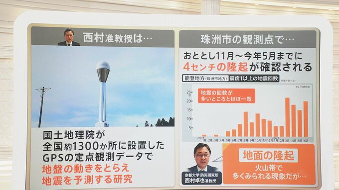 これについて、元となったデータがあります。GPSなどが搭載されており、国土地理院が全国約1300か所に設置している定点観測のデータで地盤の動きをとらえ、地震を予測する研究。地震大国日本ですので、くまなく日本列島において、それを逐一、データ観測していきましょうという形です。その中で珠洲市の観測点で、おととし11月から今年5月までに4センチの隆起が確認されました。4センチもということです。