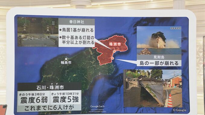 主に被害があったのが能登半島の先端、石川県珠洲市にある春日神社で鳥居1基が崩れました。数十基ある灯籠も半分以上が割れたということです。見附島では島の一部が崩れました。19日の夕方に最大震度6弱、20日の正午前には最大震度5強をいずれも観測しています。