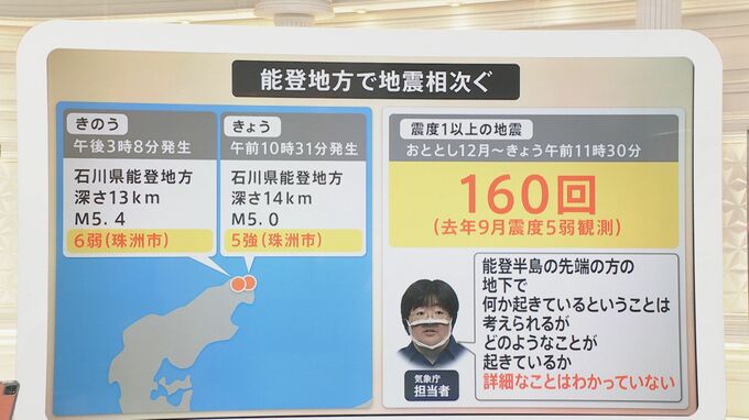 気象庁の担当者は「1年以上活発な地震活動が続いている。その中で今回は最大クラスのものが起きた」と話しています。では、なぜ起きたのかという部分については「能登半島の先端の方の地下で何か起きているということは考えられるが、どのようなことが起きているか、詳細なことはわかっていない」と、気象庁でもなかなかつかめていないという形です。