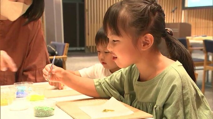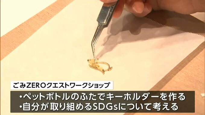 子どもたちは細かく砕いたペットボトルのふたを使ってオリジナルのキーホルダーを作ったり、自分たちが取り組めるSDGsについて考えたりしていました。