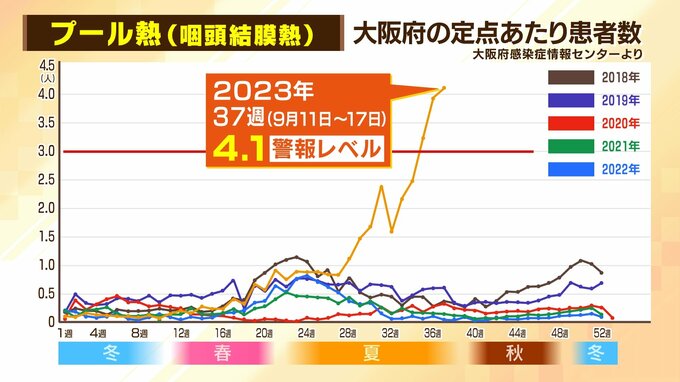 ーー「プール熱(咽頭結膜熱)」の2018年からの大阪府内での定点あたりの患者数は、2023年に患者数が急増し、4.1で警報レベルだということです。大変今年は増えているということですが、実感はありますか?