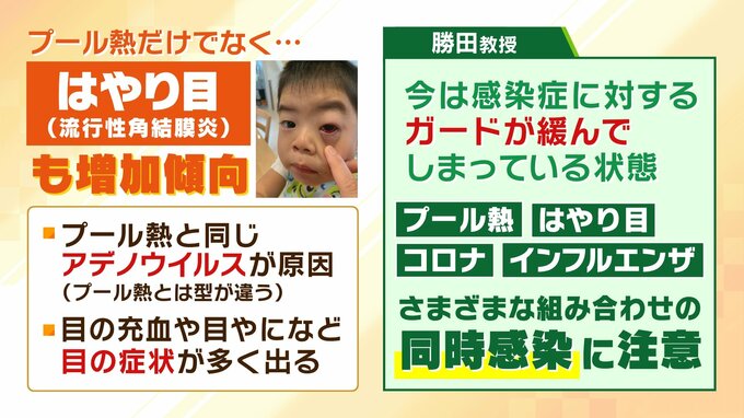 ーー「はやり目」も増加傾向だということです。プール熱と同じアデノウイルスが原因で、プール熱とは型が違うということです。目の充血や目やになど、目の症状が多く出る。「はやり目」も注意が必要ということなんですね?