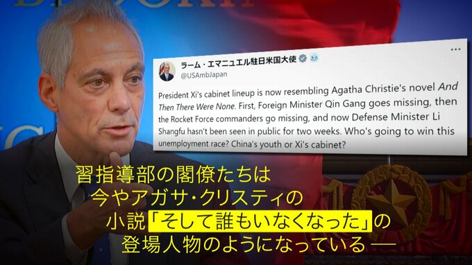 こうした中、エマニュエル大使は中国国内で起きている“ある状況”を、「何かが怪しい」と指摘した上で、有名な小説になぞらえました。