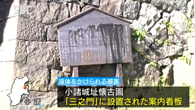 被害が確認されたのは、小諸城址懐古園の玄関口にあたる、「三之門」に設置された案内看板で、1日午前8時ごろ、黒色の液体がかけられているのを市の職員が見つけました。