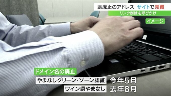 オークションサイトで売買されていたのは県がかつて使用していたドメイン名、つまりホームページのアドレスで「やまなしグリーン・ゾーン認証(greenzone-ninsho.jp)」と「ワイン県やまなし(wine-ken.jp)」です。