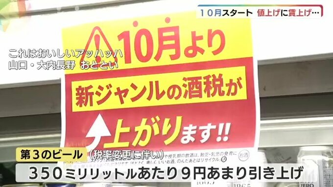 酒類は税率変更に伴い、「第3のビール」が350ミリリットルあたり9円あまり値上げになりました。