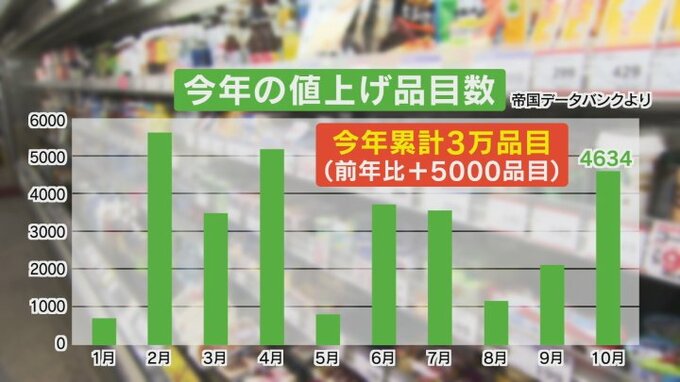 10月値上がりする食品は4634品目です。今年の値上がりはすでに3万品目を超え、去年を5000以上上回っています。