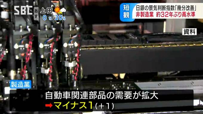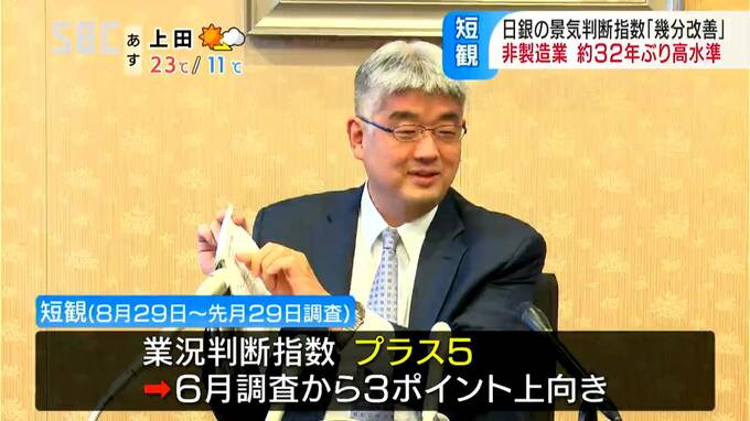 日銀松本支店が公表した短観=企業短期経済観測調査によりますと、景気が「良い」と答えた企業から「悪い」と答えた企業を引いた業況判断指数は「プラス5」で6月の調査から3ポイント上向きました。