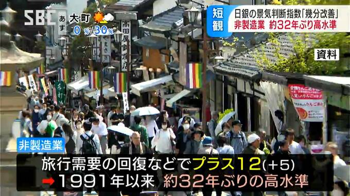 一方、非製造業は、インバウンドや団体旅行の需要の回復などにより、5ポイント上がって「プラス12」と、およそ32年ぶりの高い水準となりました。