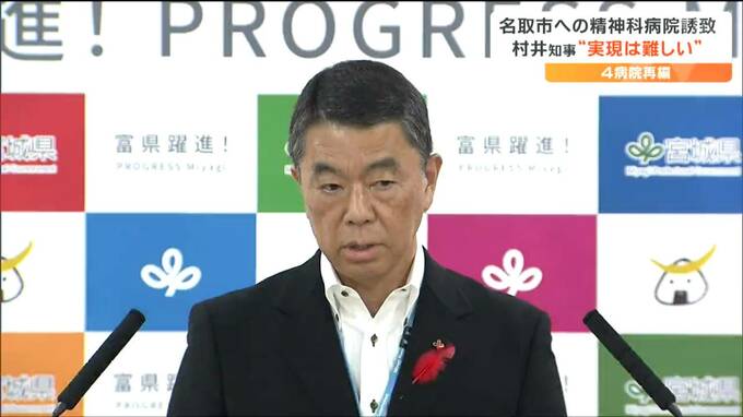 4病院再編構想をめぐり宮城県が計画している名取市への新たな精神科病院の誘致について、村井知事は2日「前向きに考えている病院はない状況」などと述べ、実現は難しいとの認識を示しました。村井嘉浩知事:「病院…