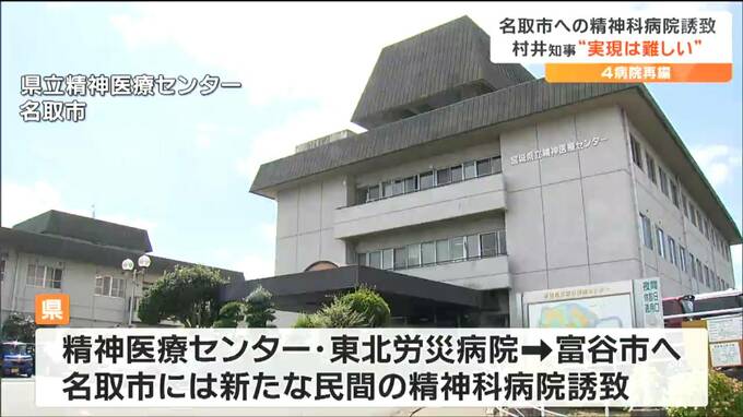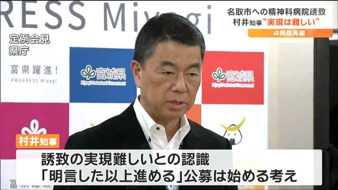 4病院再編構想をめぐり宮城県が計画している名取市への新たな精神科病院の誘致について、村井知事は2日「前向きに考えている病院はない状況」などと述べ、実現は難しいとの認識を示しました。