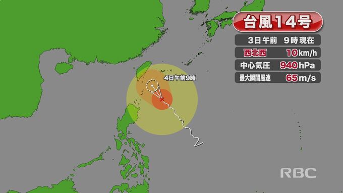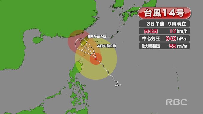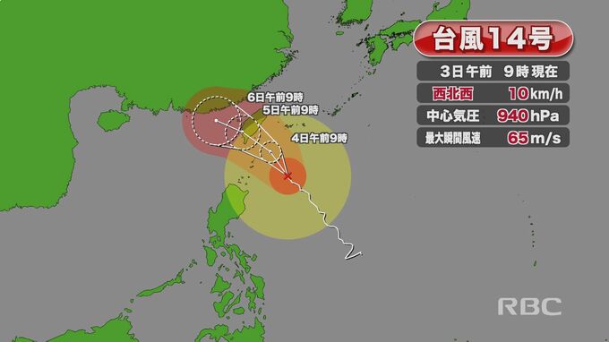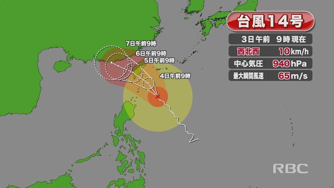 【台風情報】『非常に強い』台風14号 4日にかけ八重山地方に接近、警報級の大雨のおそれも 石垣島では対策に追われる漁師の姿 琉球放送 2023年10月3日(火) 11:49 国内 きょうから5日後までの台風の進路予想図 10月3日午前9時現在の予想進路図 10月4日午前9時現在の予想進路図 10月5日午前9時現在の予想進路図 10月6日午前9時現在の予想進路図 10月7日午前9時現在の予想進路図