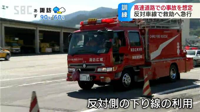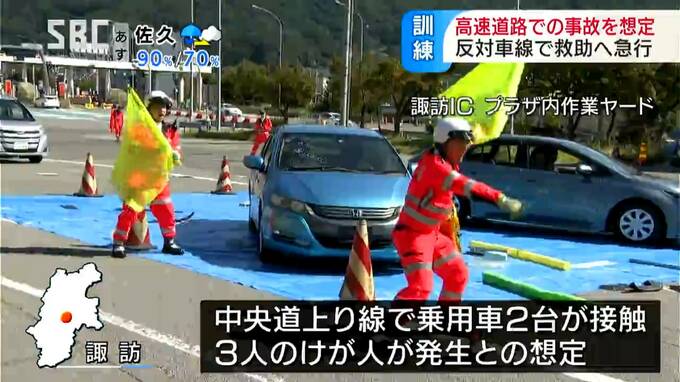 訓練は、諏訪市の中央道上り線で乗用車2台が接触し、3人のけが人が出たとの想定で行われました。