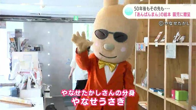 やなせたかしさんの分身、「やなせうさぎ」が登場したのは、香美市にある「詩とメルヘン絵本館」。アンパンマンを、アニメだけでなく絵本でも読み継いでいってもらおうという思いから、美良布(びらふ)保育園の園児たちに、アンパンマンの絵本6冊が贈られました。